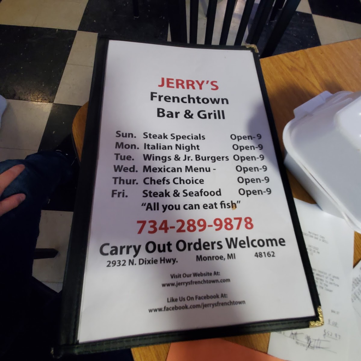 With a dedicated staff led by Crystal and Alicia, expect service that feels personal and welcoming. Whether you're grabbing a quick carryout or settling in for a night of fun, Jerry's Frenchtown Bar is a must-visit for anyone seeking delicious food and a delightful experience.